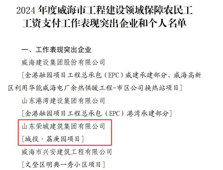我司城投?荔庚園項目榮獲2024年度威海市工程建設領域保障農民工工資支付工作表彰